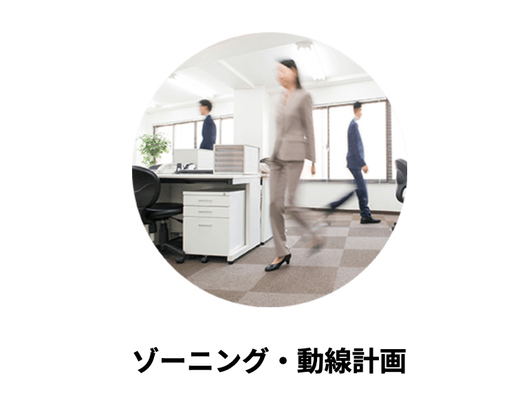 ゾーニング(区域分け)は必要な空間とその関係を把握し、効率よく仕事ができるよう配置します。動線計画では安全性やセキュリティを考え、スムーズに人が移動できるようにします。